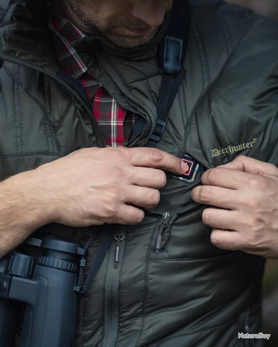 Gilet chauffant matelassé Deerhunter Heat équipé d’une fonction HEAT, qui permet d’une simple pression sur le bouton marche de la poche poitrine, d’activer le système chauffant. Les éléments chauffants sont placés dans les zones suivantes :